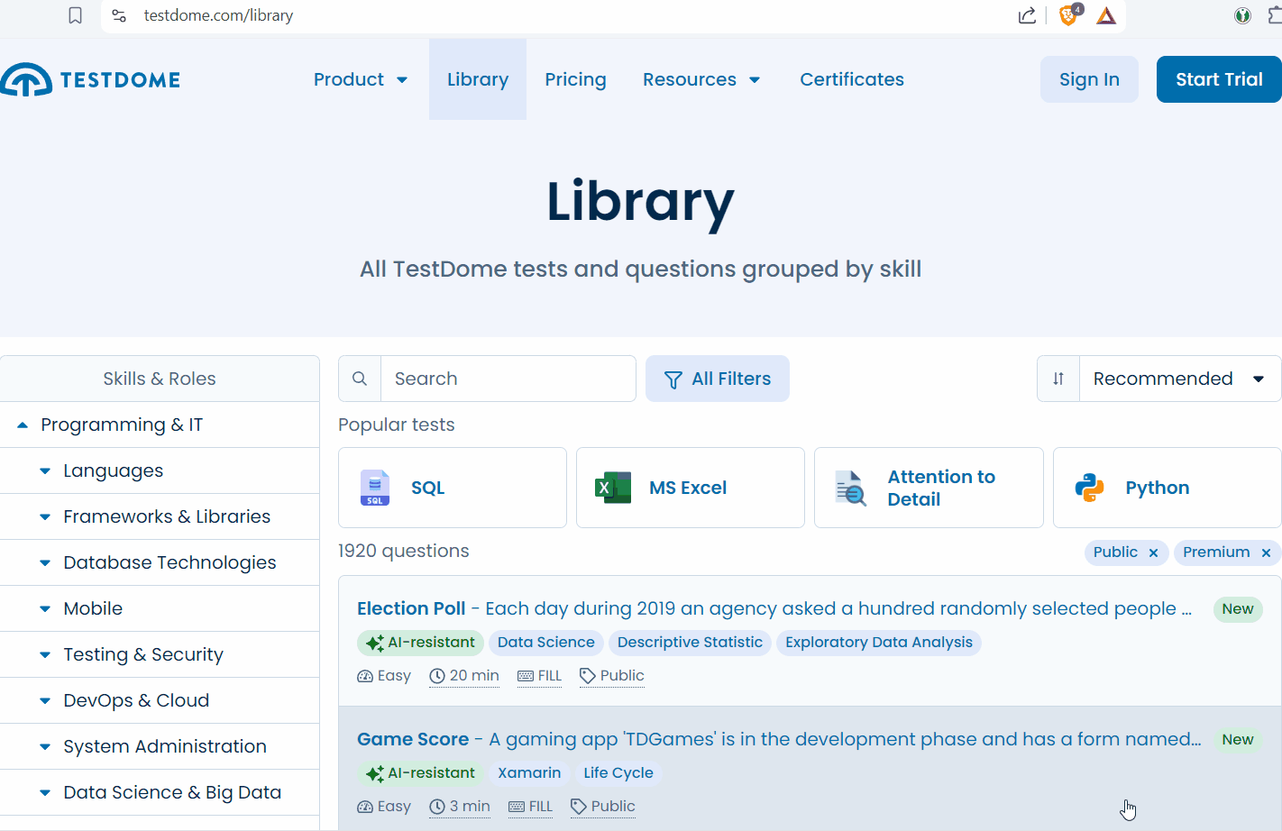 - Browse https://www.testdome.com/library to find some coding tests to practice and become familiar with the platform. There are several hundreds of questions in many various categories. You can try and fail and learn again and again.